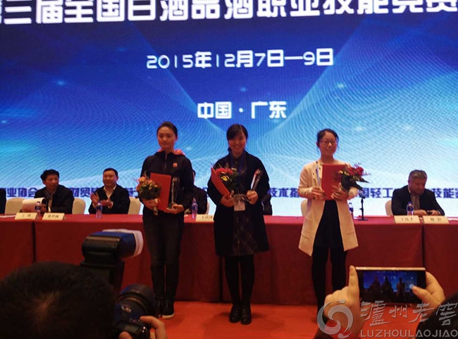 12月9日,“中國技能大賽第三屆全國白酒品酒職業技能競賽決賽”圓滿結束,瀘州老窖派出了8名選手參賽。在與全國各省市州數萬名品酒師層層選拔的256名頂級高手的較量中,瀘州老窖團隊取得了優異成績。其中張煉取得個人競賽第二名、榮獲“全國技術能手”稱號;鄭蕾第八名,榮獲“全國釀酒行業優秀選手”稱號;陳永利第十一名,榮獲“全國釀酒行業優秀選手”稱號;劉世龍第二十一名,榮獲“全國優秀選手”稱號。綜合整體排名瀘州老窖名列第一,彰顯其在行業中“濃香鼻祖”的技術實力地位。 左邊獲獎者為瀘州老窖參賽選手張煉 2015年中國技能大賽第三屆全國白酒品酒職業技能競賽決賽于12月7日在佛山舉行。本次競賽決賽為期三天,通過白酒理論考試和品評技能競賽進行打分評比。其中理論考試共300題采用計算機答題方式,品評能力競賽共16輪次采用中國酒業協會計算機品評能力測試系統。競賽由中國酒業協會、中國財貿輕紡煙草工會、中國就業培訓技術指導中心、中國輕工業職業技能鑒定指導中心共同舉辦。本次大賽旨在深入貫徹黨的十八大精神,落實黨中央國務院提出的全面實施人才強國戰略要求,進一步激發廣大職工“學知識、練技術、比技能、創一流”的工作熱情,促進我國白酒行業的技術交流和技術創新,加快培養高技能人才,全面提高職工隊伍的技術技能水平和整體素質。