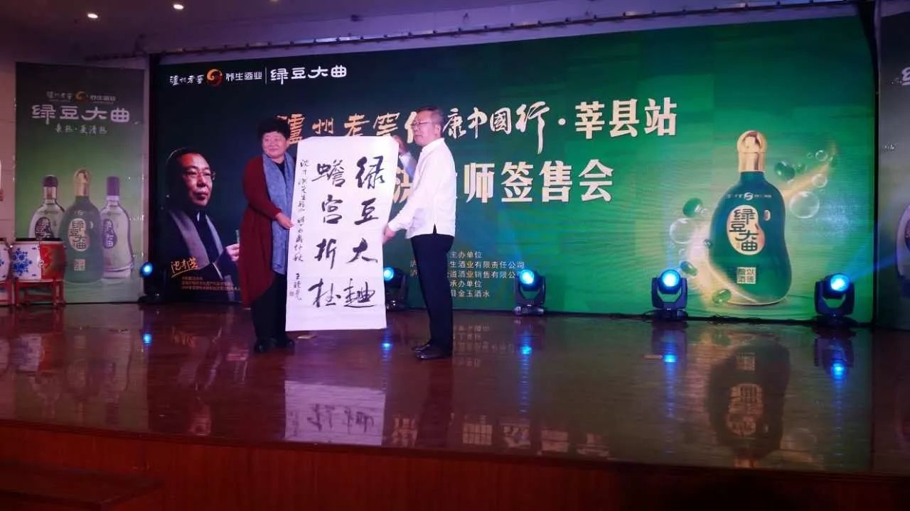 經過國慶長假的休整,10月9日,“綠豆大曲健康中國行”第59站來到了抗日戰爭時期冀魯豫抗日根據地、革命老區——山東莘縣。 簽售會伊始,沈才洪大師在眾人的簇擁下來到了會場,在簽名墻上留下了簽名,并與經銷商朋友及嘉賓們合影留念!主持人宣布簽售會正式開始時,臺下的嘉賓們已經紛紛起身來到臺前排隊等候大師的簽名酒,長長的隊伍中有一位抱著孩子的女士,身著“綠豆大曲”綠色馬甲的工作人員(綠衫軍)在征得大家的同意后,迅速上前將女士引入前排率先簽名,活動在井井有條地進行,而“綠衫軍”的謙遜有禮也處處體現! 沈才洪大師與經銷商朋友、嘉賓合影
